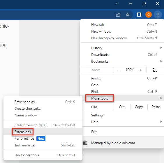 - This will open your Extensions list. You can then either deactivate your ad-block extension or white list bionic-ads.com.