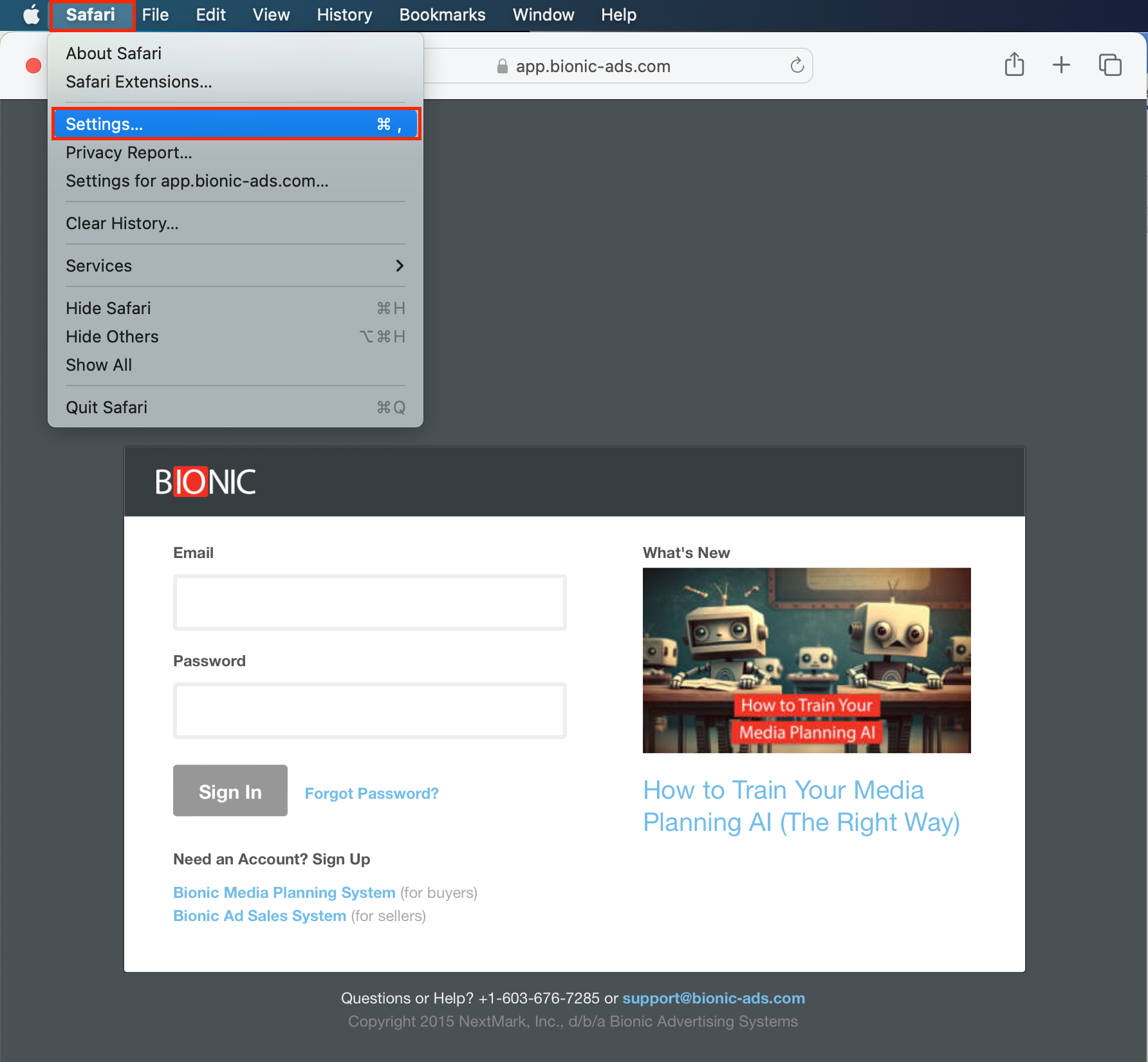 - In the Menu Bar click Safari and select Settings. Or press CMD and the comma key.