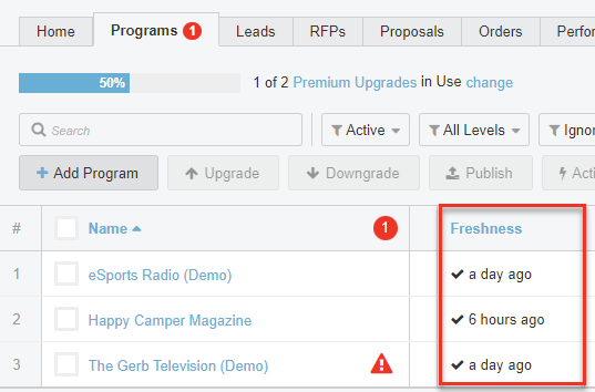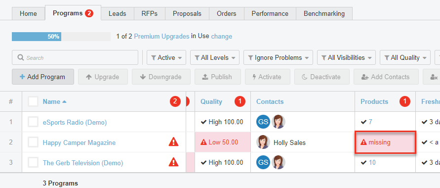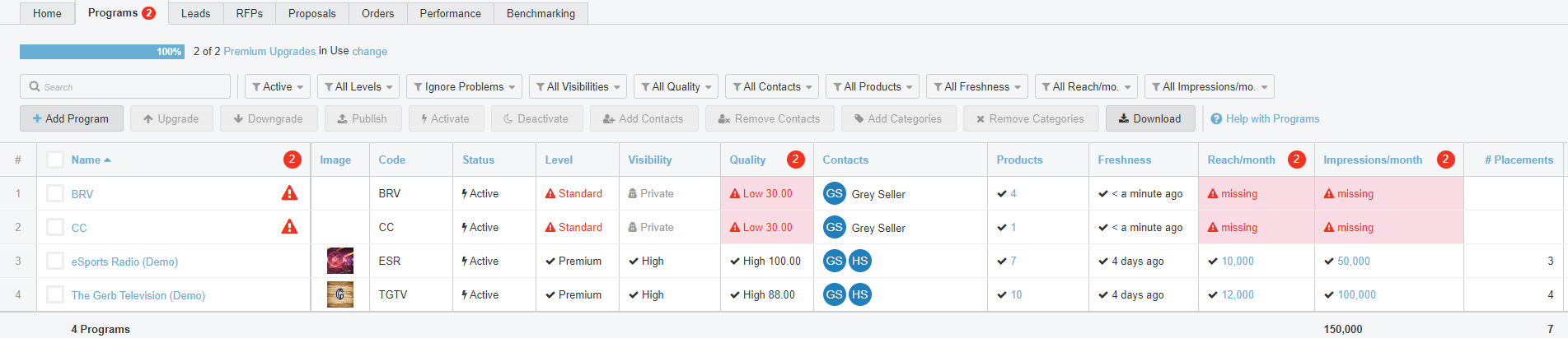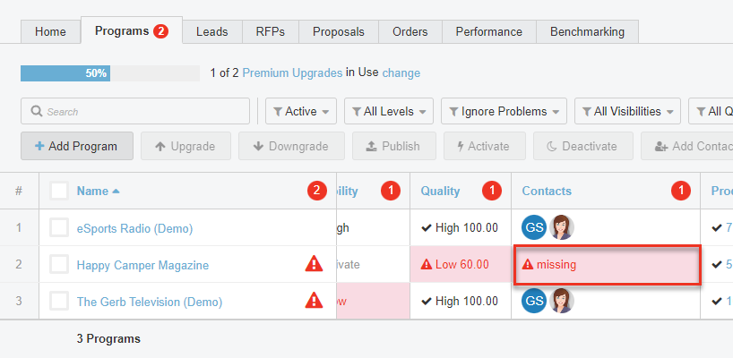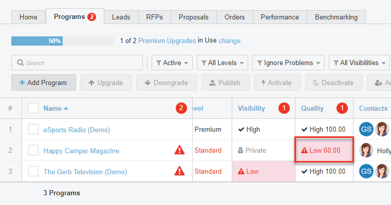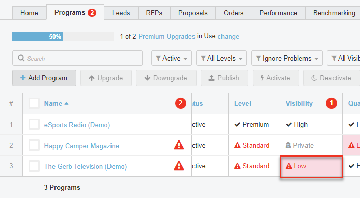 - Low - Low visibility programs have been published (media planners can see them), but are considered Standard listings. You can upgrade your programs to Premium to gain High visibility. You can learn how to upgrade in Manage Your Advertising Programs.