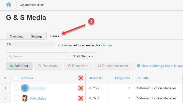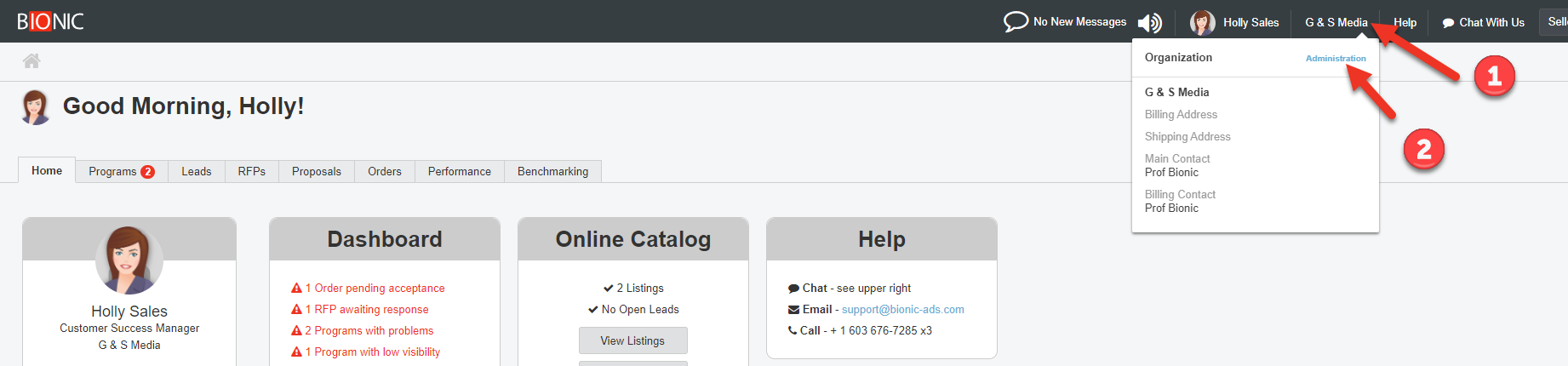 Screenshot of the top bar in Bionic for Ad Sales. The company name has been clicked on, revealing a menu where "Administration" is being pointed to as well.Screenshot of the Users tab in the administration settings. The "Users" tab is being pointed to.