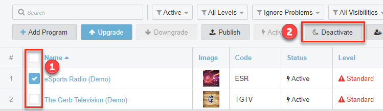 - Place a check mark next to the Program(s) you want to deactivate. Use the checkbox at the top to select all displayed Programs.