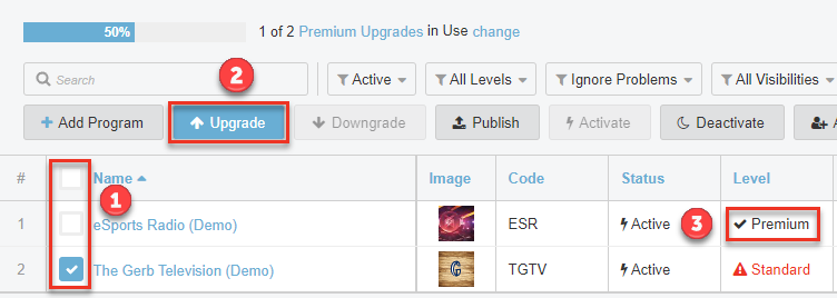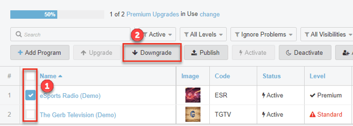 - Place a check mark next to the Program(s) you want to downgrade. Use the checkbox at the top to select all displayed Programs.