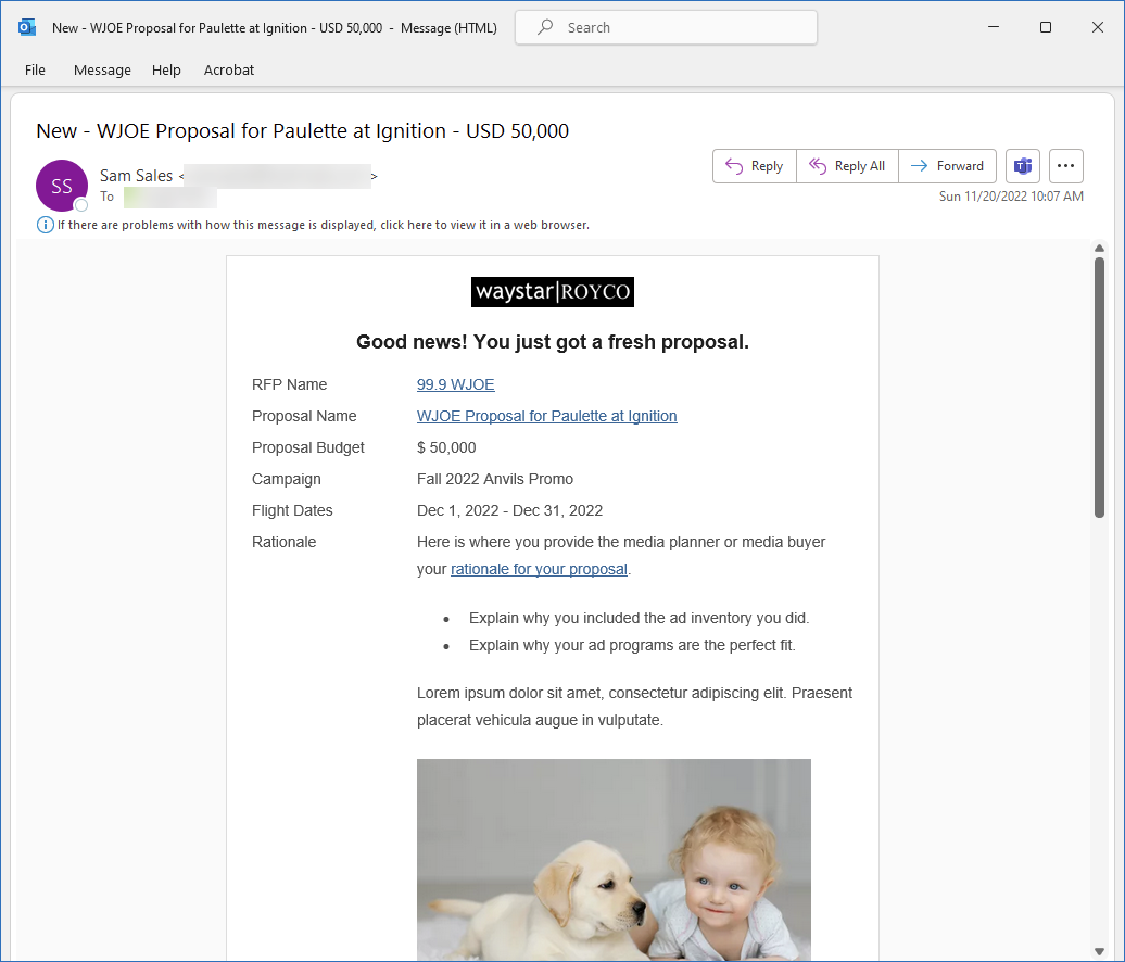 Screenshot of the email a media buyer would see when a Proposal is sent.