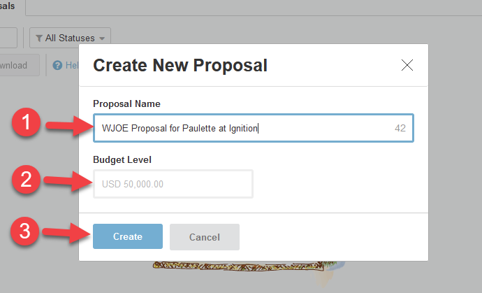 Screenshot of the pop-up allowing a user to create a new proposal. Arrows with numbers point to the fields correlating with the steps listed above.