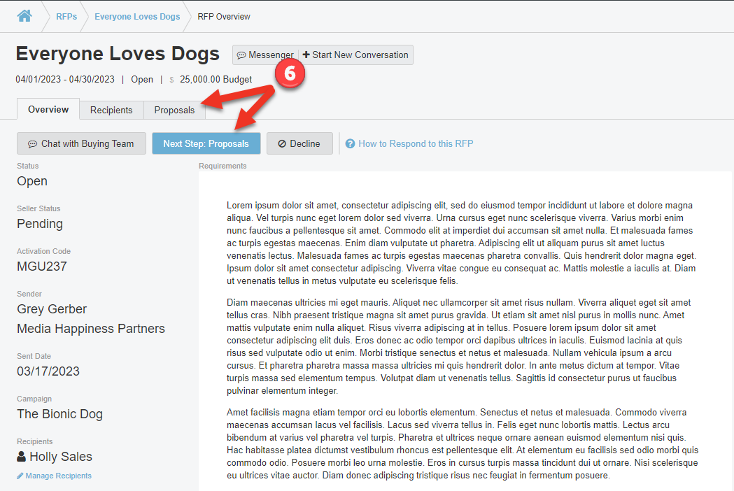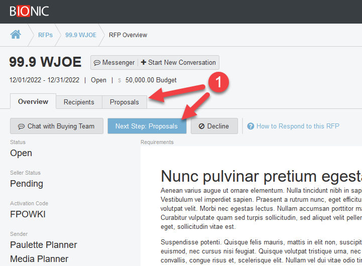 Screenshot of the Overview tab in an RFP. The 2 options for going to Proposals have been pointed to