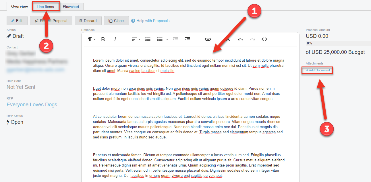 Screenshot of the Proposal overview. Arrows are pointing to the "Rational" field, "Line Items" tab, and the "Add Document" button.