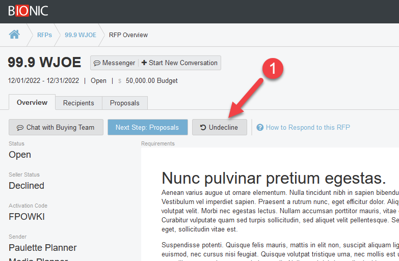 Note: Declining an RFP is not permanent. You can Undecline the RFP to reverse this action